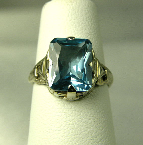 octagon aquamarine was replaced with a similar lab created aquamarine. This is a small ring, measuring size 3 1/2. SORRY!