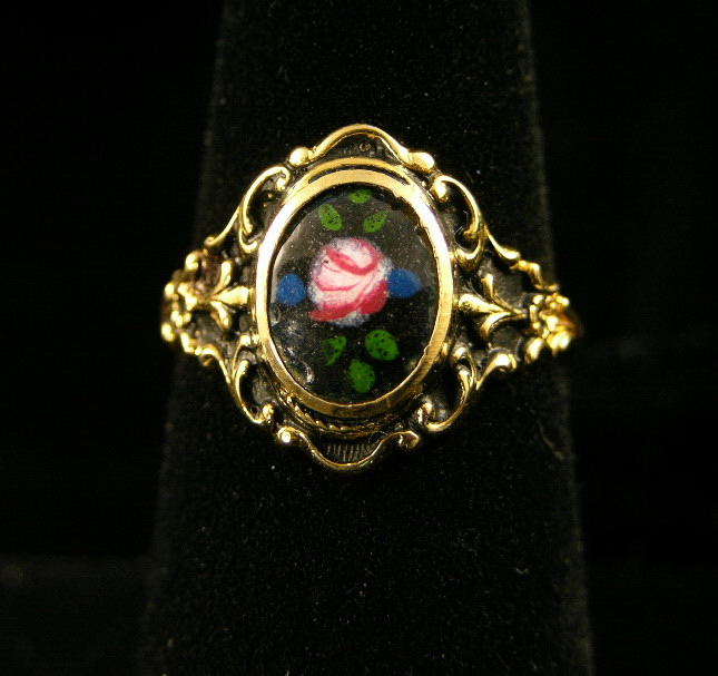 Early 20th century circa 1915 dates this wonderful enamel ring with sweet rose motif.