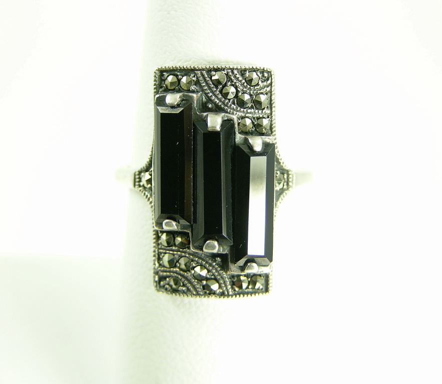 onyx are lined-up in a slanted pattern surrounded by bead set marcasites. The shoulder of the ring also has a nice taper