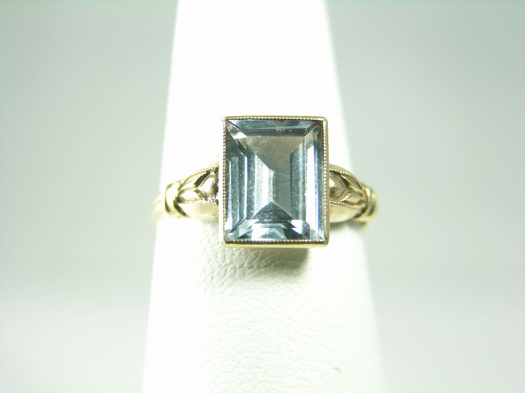 This ring, the birthstone for March, is emerald cut and set in a most attractive 10k yellow gold bezel setting. The