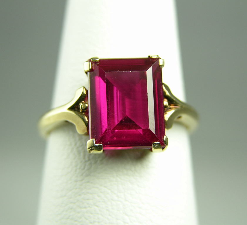 Attractive created ruby ring in a 10k yellow gold setting. The 3 carat ruby is a soft