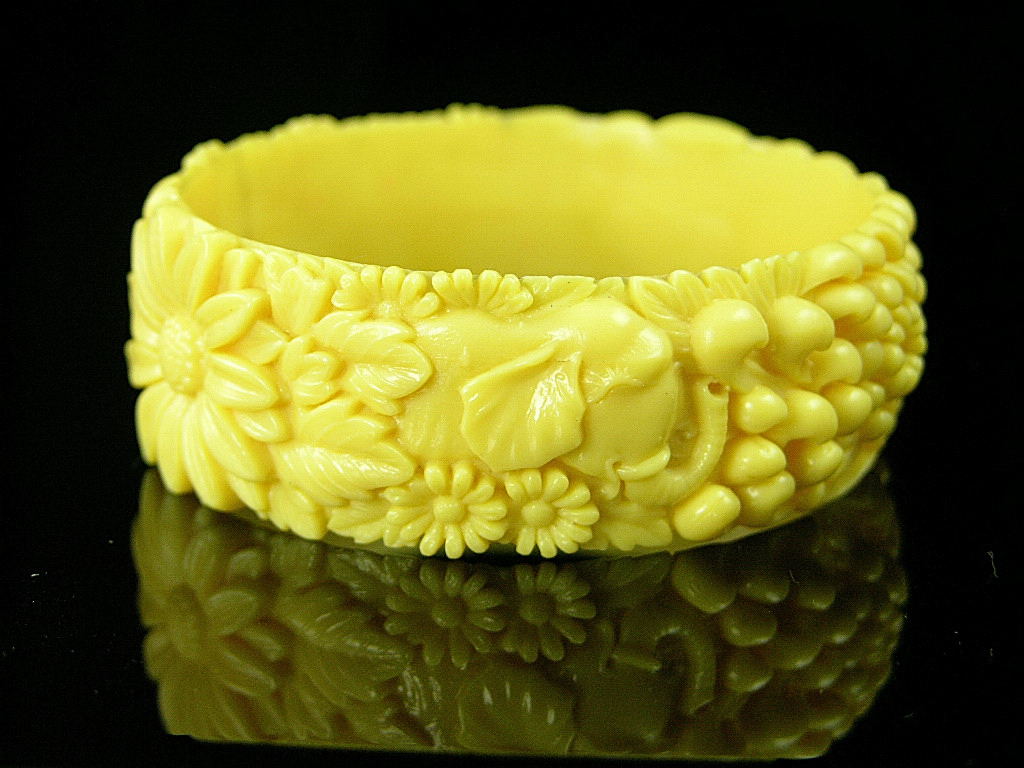 This celluloid bangle features an elephant peeking his head through daisies and roses.