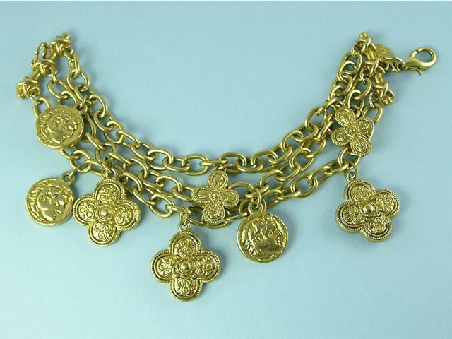 cute three strand charm bracelet made of antiqued gold tone sturdy links and dangling coins and crosses. The crosses