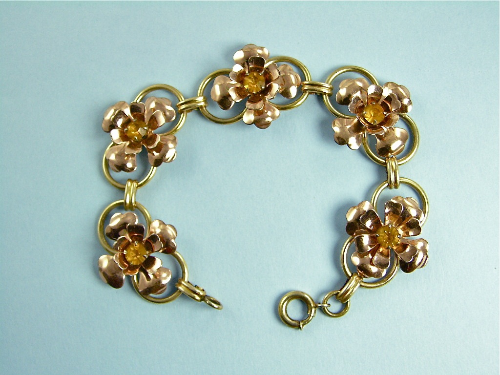 Wonderful Retro Harry Iskin bracelet is a classic 5 link bracelet in the 1940s Retro style, made of blooming rose gold flowers with amber