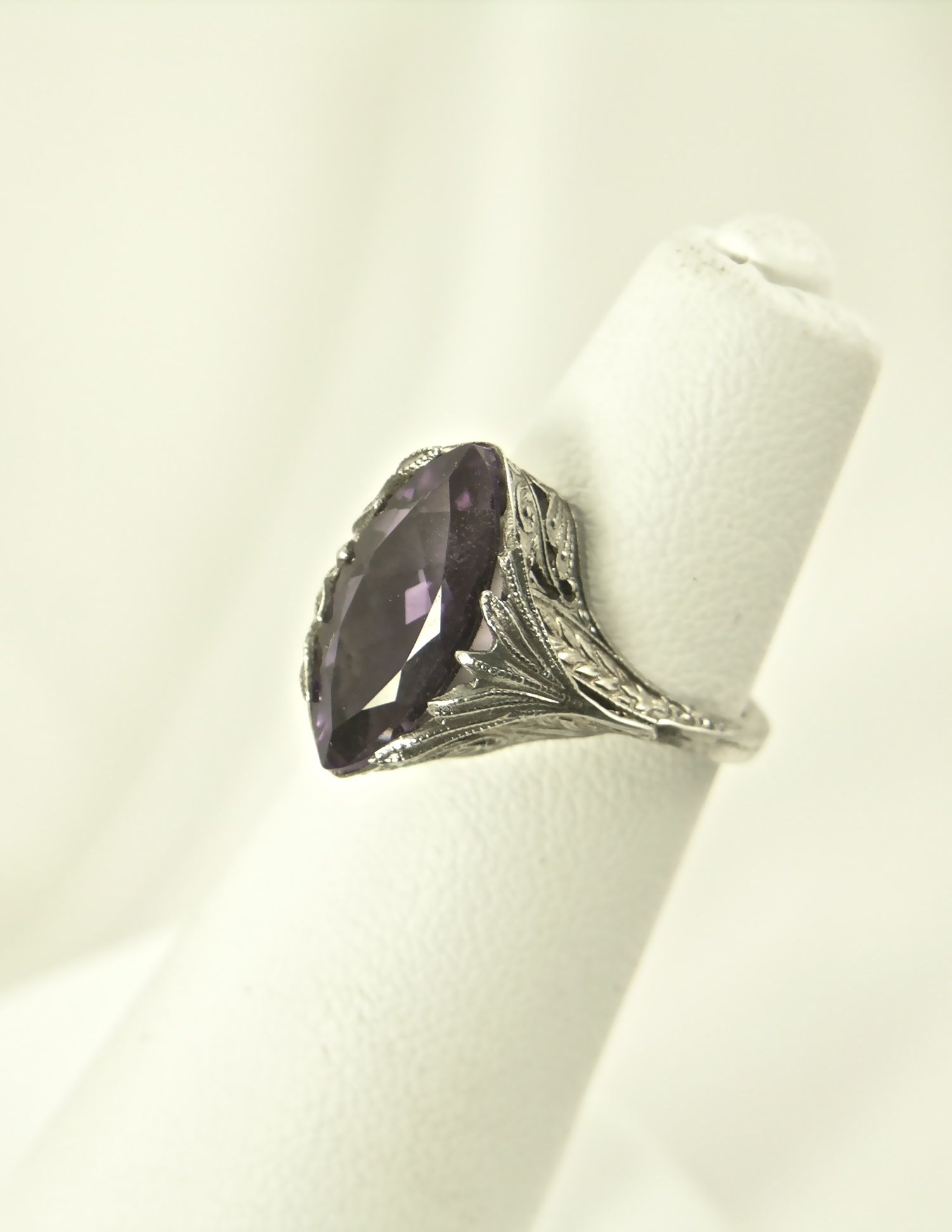 Superb authentic Art Deco Sterling silver filigree ring is die struck with a beautiful setting for a marquise shaped cut amethyst
